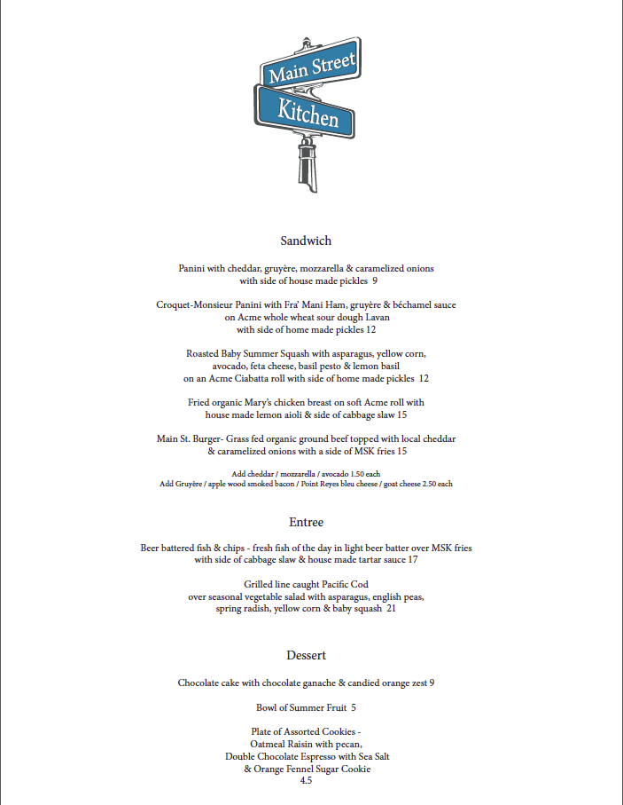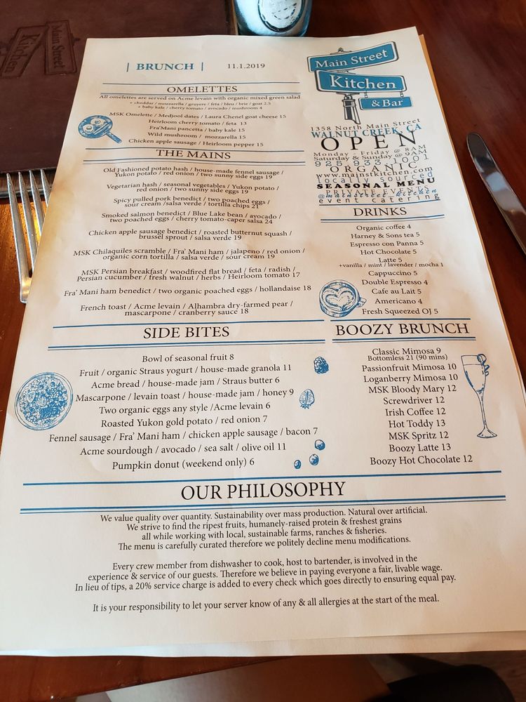 Main Street Kitchen, located in Walnut Creek, CA, is a modern European and New American restaurant with a focus on quality ingredients and diverse menu options. The restaurant offers a range of utilities, including delivery, takeout, and outdoor seating, making it a versatile dining experience. The menu at Main Street Kitchen features vegan and vegetarian options, as well as a full bar with delicious cocktails.